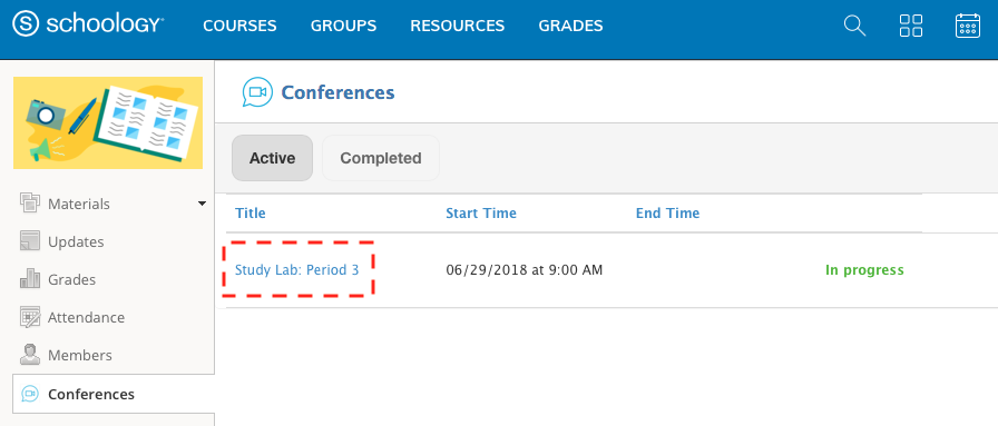 - Haga clic en la aplicación Conferencias en el menú de la izquierda en el curso o grupo donde está instalado.