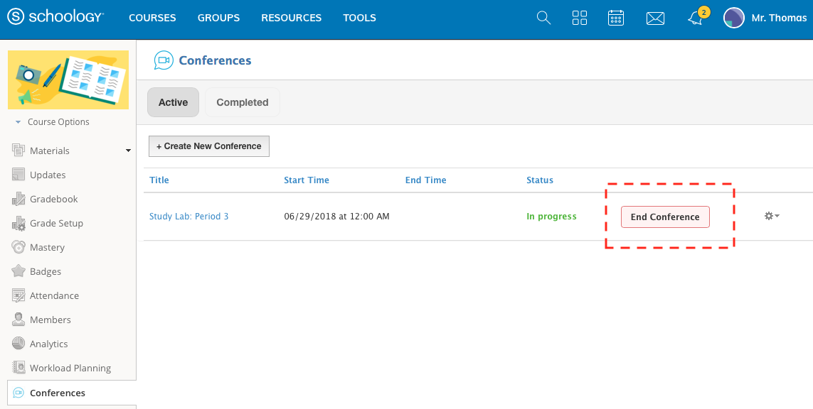 Para finalizar la conferencia, el administrador de cursos o grupos debe seleccionar Finalizar conferencia dentro de Schoology. Los participantes pueden cerrar el navegador para salir de la conferencia.