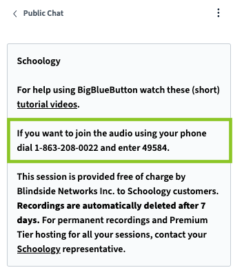 - Los administradores pueden otorgar este número a los miembros que desean unirse a una conferencia por teléfono en vez de utilizar la aplicación Conferencias en Schoology.