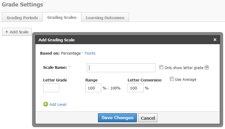 Los administradores del sistema pueden crear escalas de calificación por porcentajes o puntos que aparecerán de inmediato en cada uno de los cursos de su escuela u organización. Esta función le simplifica la tarea de mantener la coherencia en todo el sistema.