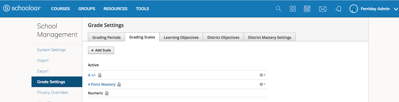 Como administrador del sistema, cuando navega a Herramientas > Administración del centro educativo > Configuración de calificaciones, verá una nueva pestaña denominada Escalas de calificación. Desde aquí, haga clic en Agregar escala para comenzar a crear su escala de desempeño del distrito.