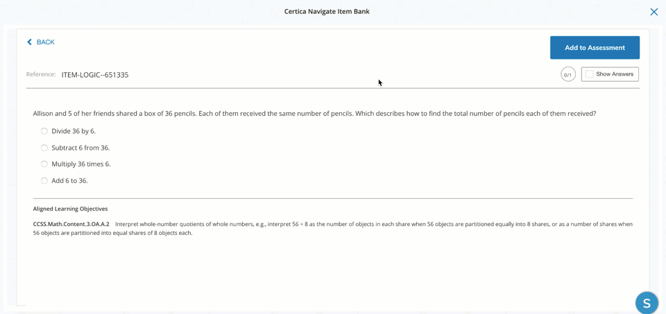 Haga clic en el número de referencia del elemento (ITEM-LOGIC-651335 en el ejemplo anterior) para obtener una vista previa del elemento. En la vista previa del elemento, puede revisar el elemento, verificar el objetivo de aprendizaje alineado y ver la respuesta correcta por medio de la opción Mostrar respuestas:
