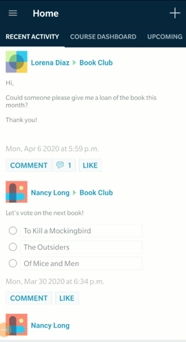 En la aplicación móvil para Android, puede agregar una tarea desde alguno de estos dos lugares: dentro de un curso o en el área Actividad reciente.