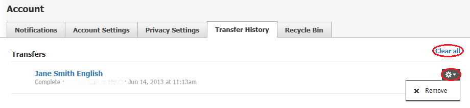 Nota: La eliminación de elementos en su historial de transferencias no eliminará la colección de sus recursos personales. No obstante, cuando no haya elementos en su historial de transferencias, esta área no aparecerá en su cuenta.