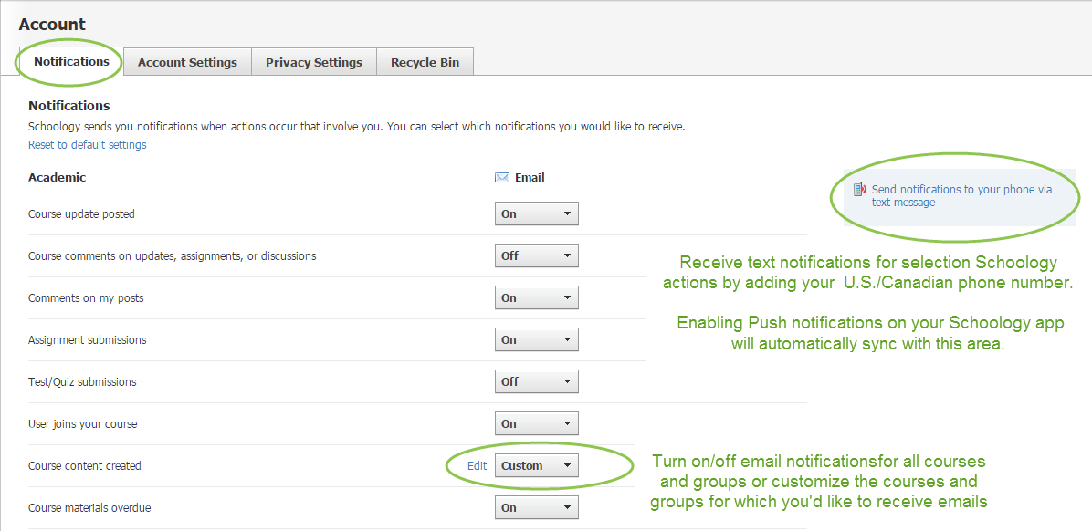 Las notificaciones por mensajes de texto también están disponibles para determinadas acciones. Siga estas instrucciones para vincular su teléfono celular a su cuenta de Schoology: