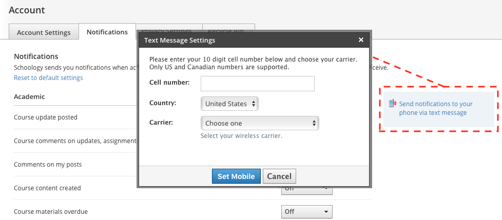 Escriba su número de teléfono celular (el número no se muestra a otros usuarios de Schoology).