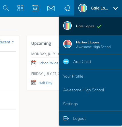 Las notificaciones electrónicas y por mensaje de texto difieren del menú Notificaciones (icono de campana) ubicado en la parte superior de Schoology. Las notificaciones enumeradas debajo del icono de campana no se pueden personalizar. Proporcionan una lista activa de las acciones académicas relacionadas con su cuenta únicamente. Si desea recibir las mismas notificaciones que recibe su hijo, le recomendamos agregar su dirección de correo electrónico o número de teléfono en el área Notificaciones de su hijo.