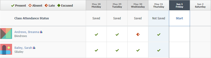 Nota: Los días que aún no transcurrieron no figuran como Guardados, incluso aunque el docente haya agregado comentarios o excepciones de asistencia. Al principio, quizás parezca ilógico, pero recuerde que no se ha tomado asistencia en esos días. No queremos confundir a los administradores del curso respecto a si se ha tomado asistencia por completo en los días en curso.