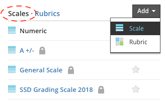 En la captura de pantalla anterior, el administrador del sistema creó las escalas con los iconos de candado en el nivel del sistema, en una organización con cuenta Enterprise. Los instructores no pueden editar estas escalas.