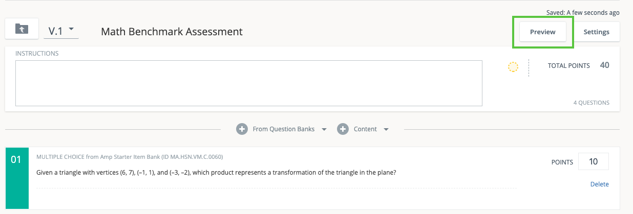 Luego de agregar los elementos a la evaluación, podrá acceder a la vista previa de los elementos mediante el botón Vista previa situado en la esquina superior derecha de la página de la evaluación gestionada: