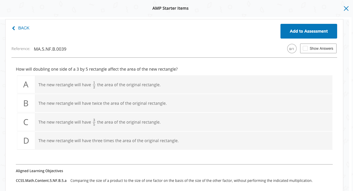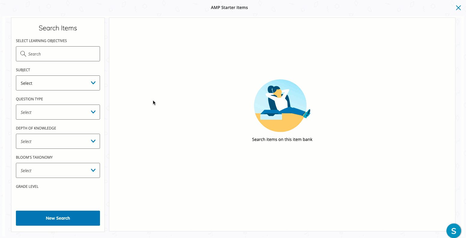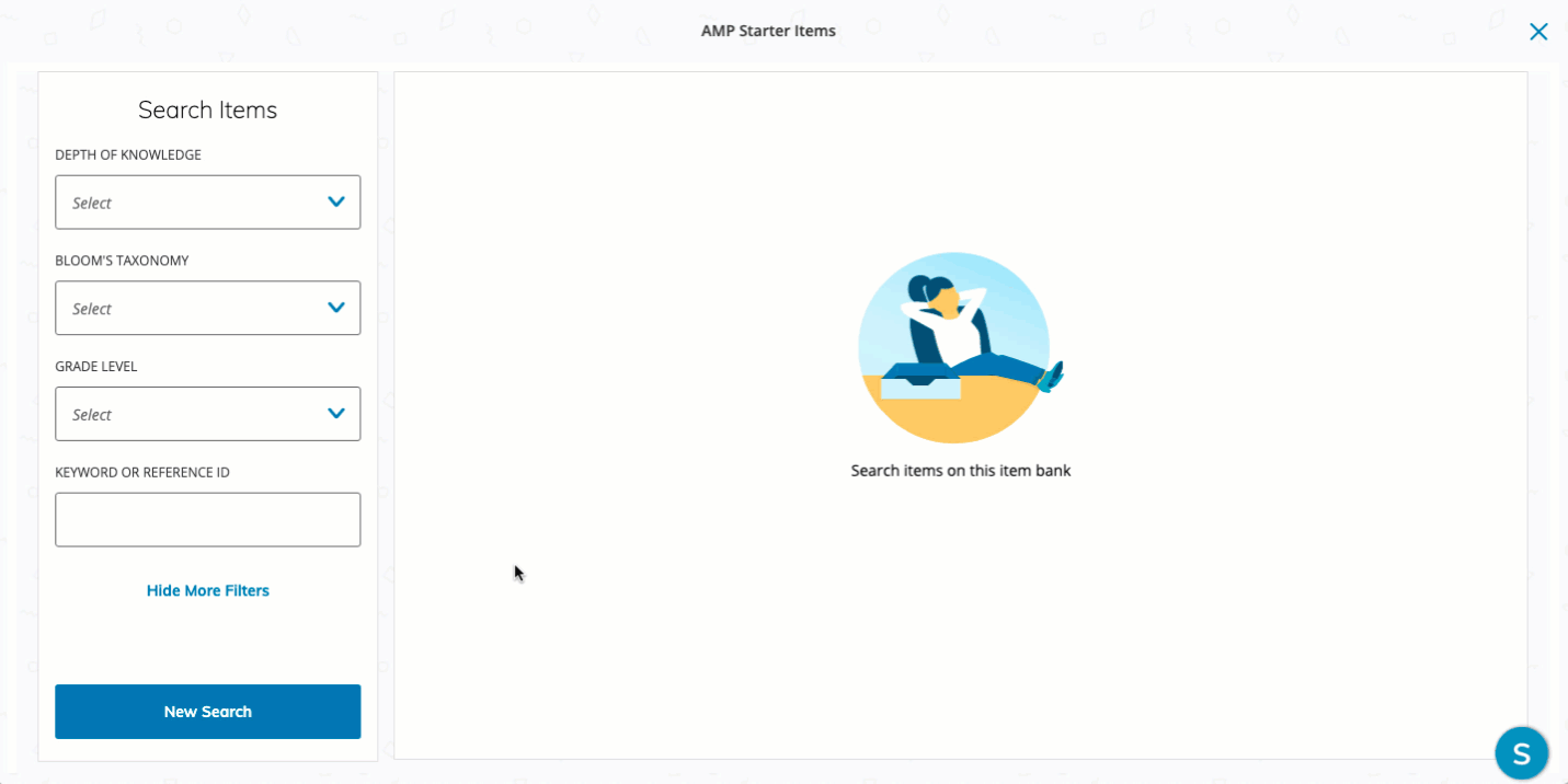 Los elementos iniciales de la AMP contienen un conjunto de elementos que incluyen los estándares esenciales comunes de Matemáticas y Lengua y Literatura en Inglés correspondientes a la educación primaria y secundaria. Los elementos pueden agregarse a las evaluaciones gestionadas en la AMP cuando los Equipos de evaluaciones elaboran las evaluaciones para su distribución en los campus. Los elementos iniciales de la AMP aparecen como una opción en el menú, lo cual permite asociar los bancos de preguntas con las evaluaciones gestionadas en la AMP.