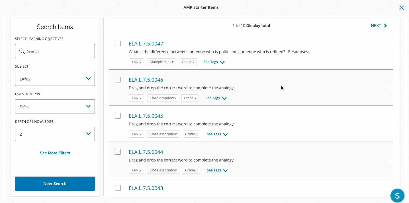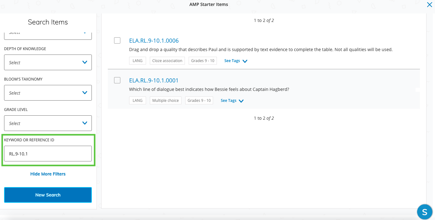 Puede realizar la búsqueda por elementos utilizando el ID de referencia del elemento (por ejemplo, ELA.RL.9-10.1.0006 como se muestra en la captura de pantalla a continuación). El ID de referencia se asigna a cada objetivo de aprendizaje en el banco de elementos. Alternativamente, puede realizar la búsqueda mediante el terminal de referencia del objetivo de aprendizaje. Por ejemplo, si desea buscar CCSS.ELA-LENGUA.RL.9-10.1, puede buscar RL.9-10.1:
