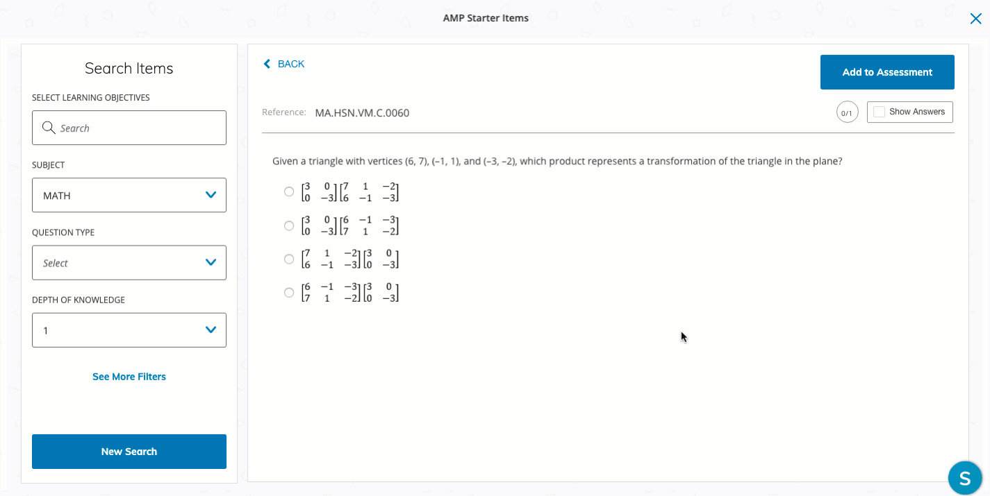 Haga clic en el título del número de referencia del elemento (por ejemplo, ELA.L.7.5.0046) para acceder a la vista previa del elemento. En la vista previa del elemento, puede revisar el elemento y ver la respuesta correcta mediante la opción Mostrar respuestas.