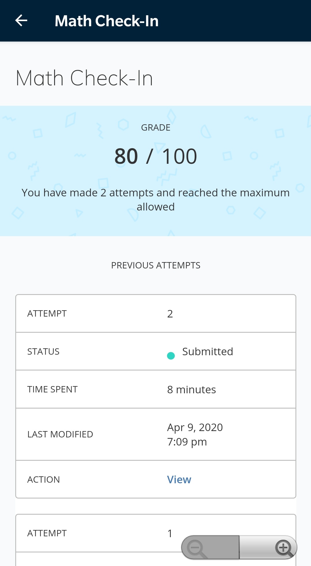 En la página de la evaluación, puede ver sus calificaciones y las entregas calificadas, o bien puede reanudar cualquier intento que aún se encuentre en progreso.