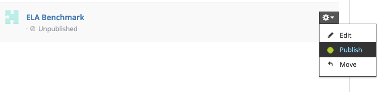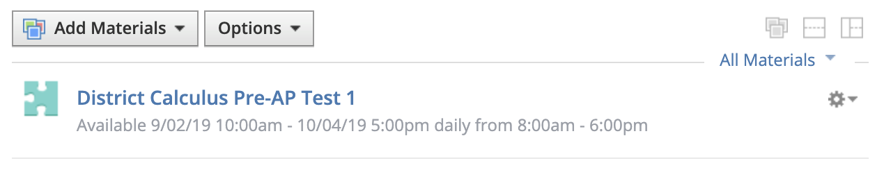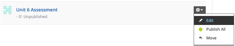 Además, puede publicar la evaluación a través del icono de engranaje situado a la derecha del elemento en la página Materiales del curso: