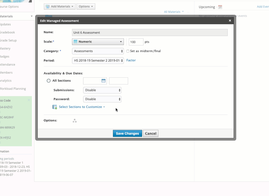 Al configurar la disponibilidad y las fechas límite en las secciones vinculadas, determine el momento en el que los alumnos podrán ver la evaluación en la página Materiales y en el panel Actividades próximas. En el ejemplo anterior, el punto verde junto al nombre de la sección indica que la evaluación se encuentra publicada. La fecha y hora refieren únicamente a la fecha límite de la evaluación y no determinan cuándo se publicará la evaluación.