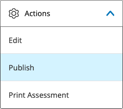 Alternativamente, puede hacer clic en el título de la evaluación para acceder a la pestaña Detalles de la evaluación. Seleccione Publicar en el menú desplegable Acciones en la esquina superior derecha: