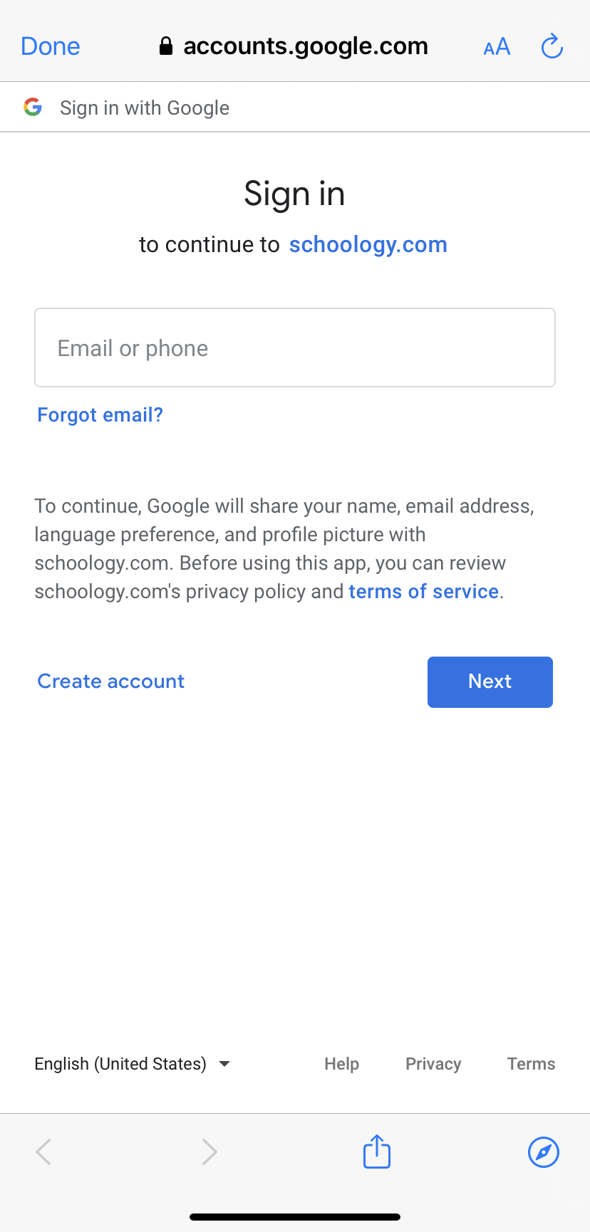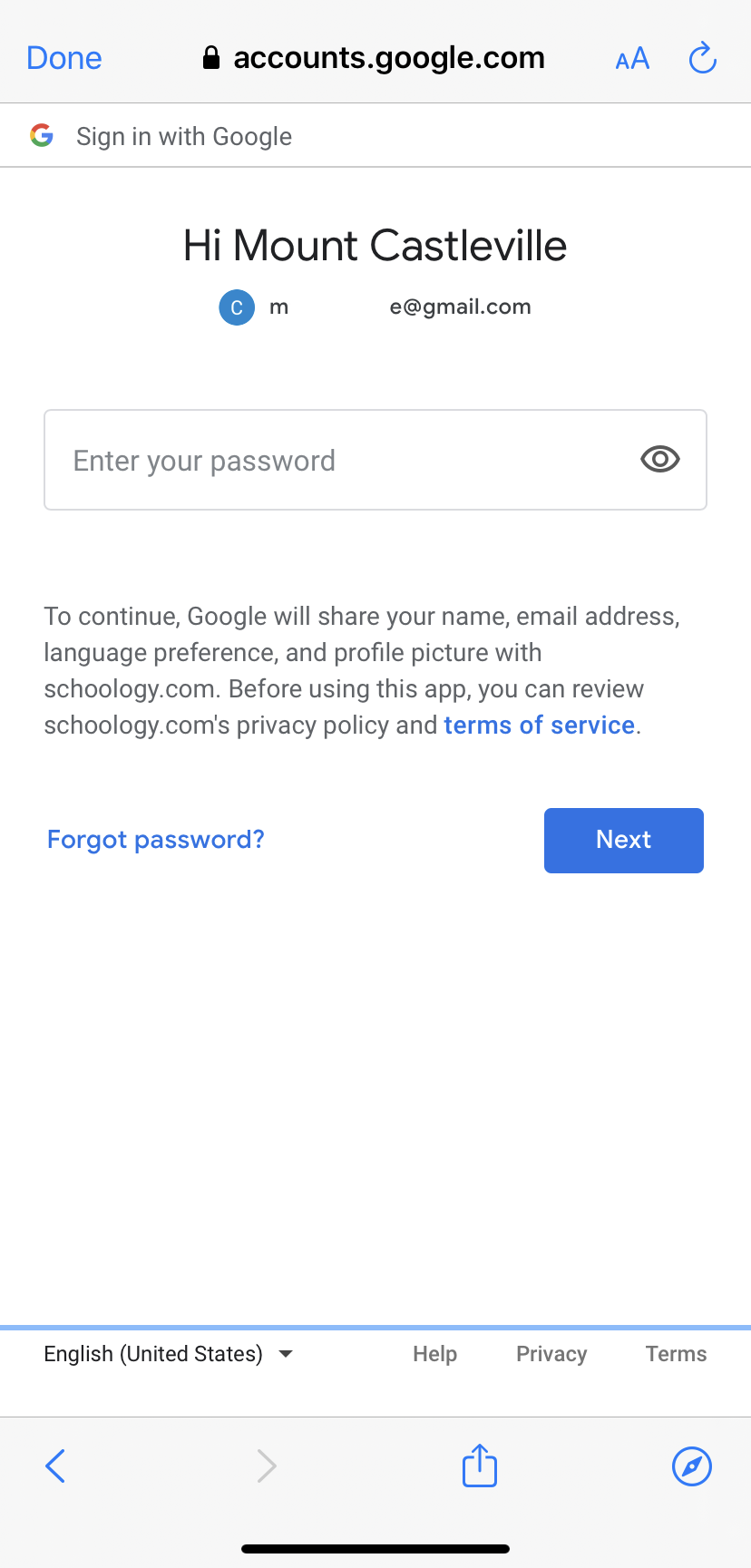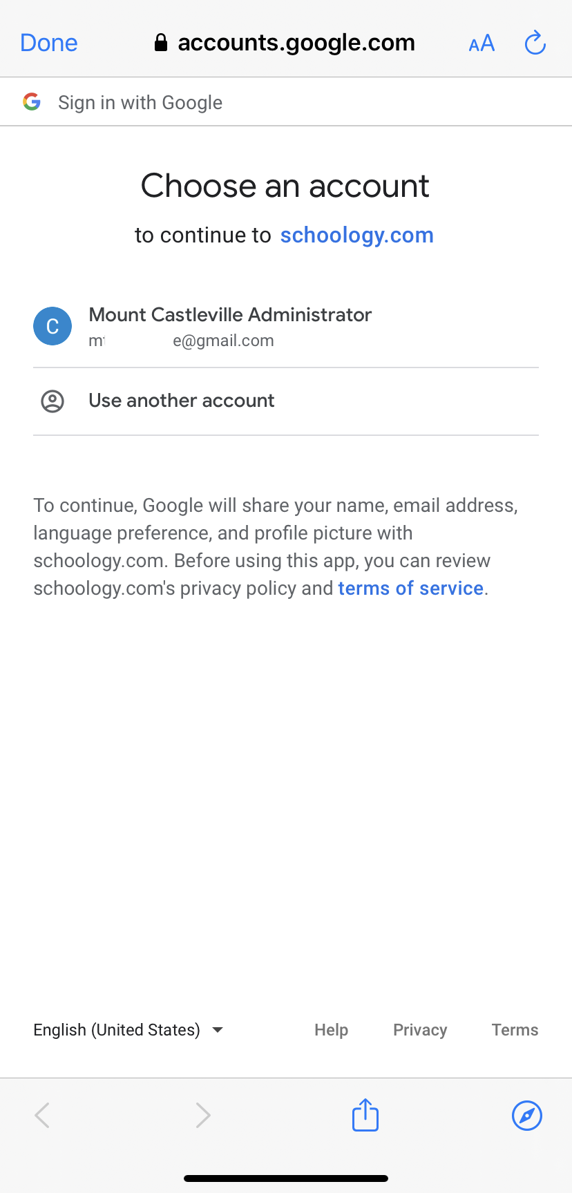 Nota: Si selecciona la cuenta incorrecta en esta ventana, deberá cerrar la aplicación de Schoology y cerrar sesión en la cuenta de Google incorrecta desde el navegador de internet de su dispositivo móvil antes de poder completar el proceso de inicio de sesión.