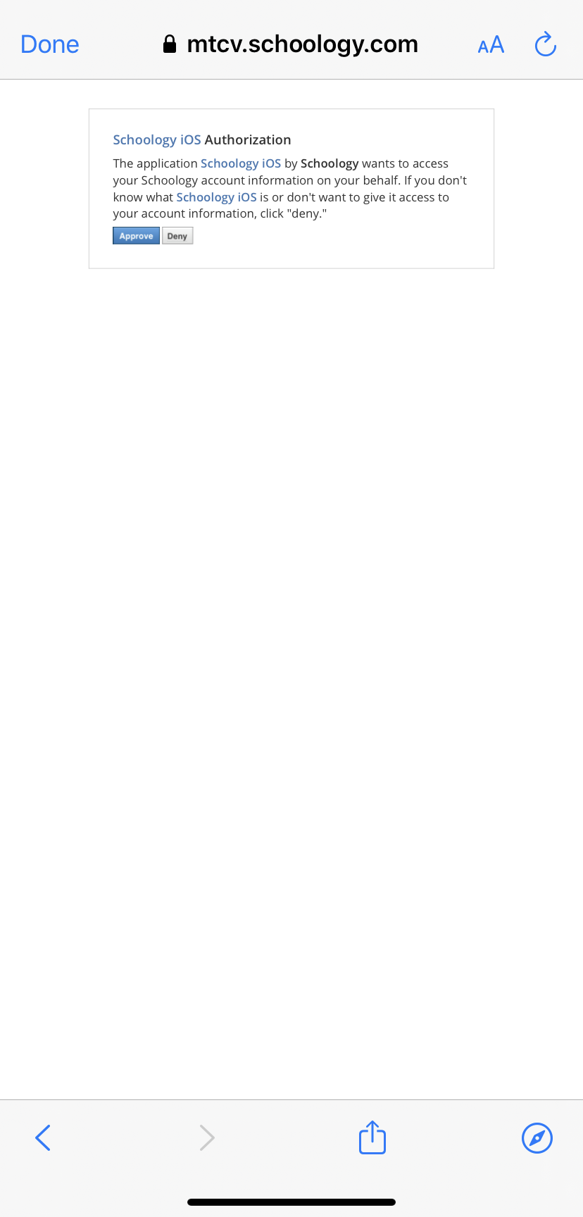 Paso 8: Pulse Aprobar para permitir que la aplicación móvil de Schoology acceda a su cuenta de Schoology. Haga clic en Denegar si no desea autorizar a la aplicación. No podrá usar la aplicación móvil hasta que haya aprobado el acceso a su cuenta.
