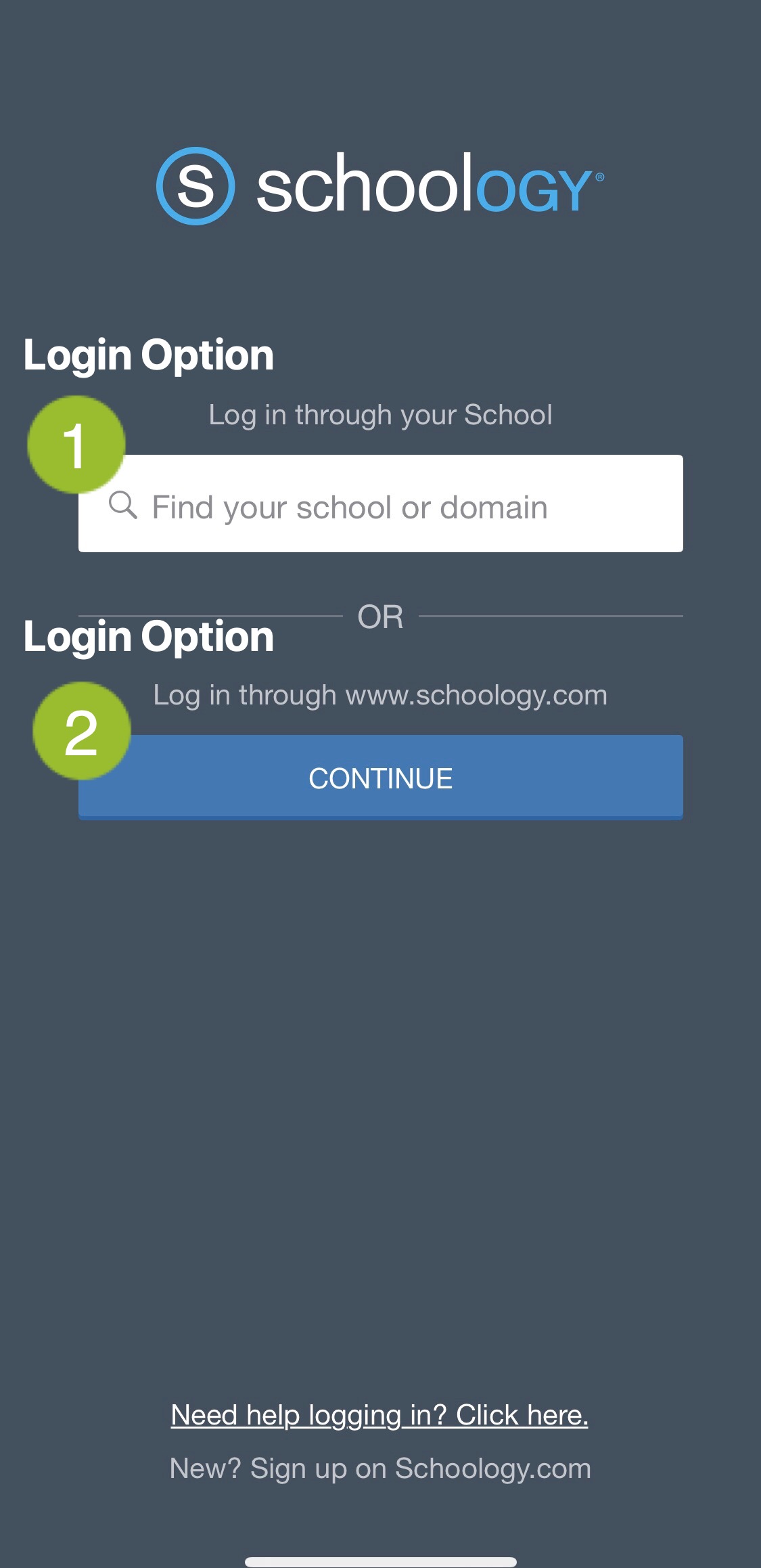 Nota para los administradores del sistema de educación primaria y secundaria: Si el servicio de autenticación de su centro educativo no incluye a los padres actualmente, estos deben seleccionar Continuar para iniciar sesión a través de www.schoology.com (consulte la Opción de inicio de sesión 2 a continuación) cuando inicien sesión desde la aplicación móvil. Si los padres están incluidos en el proceso de SSO, los padres/tutores deberán seguir la Opción de inicio de sesión 1 y seleccionar el centro educativo.