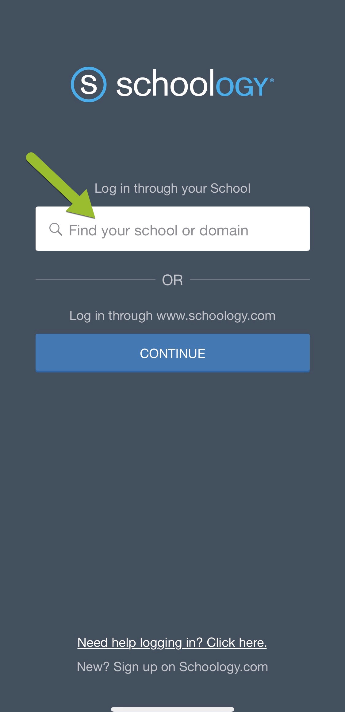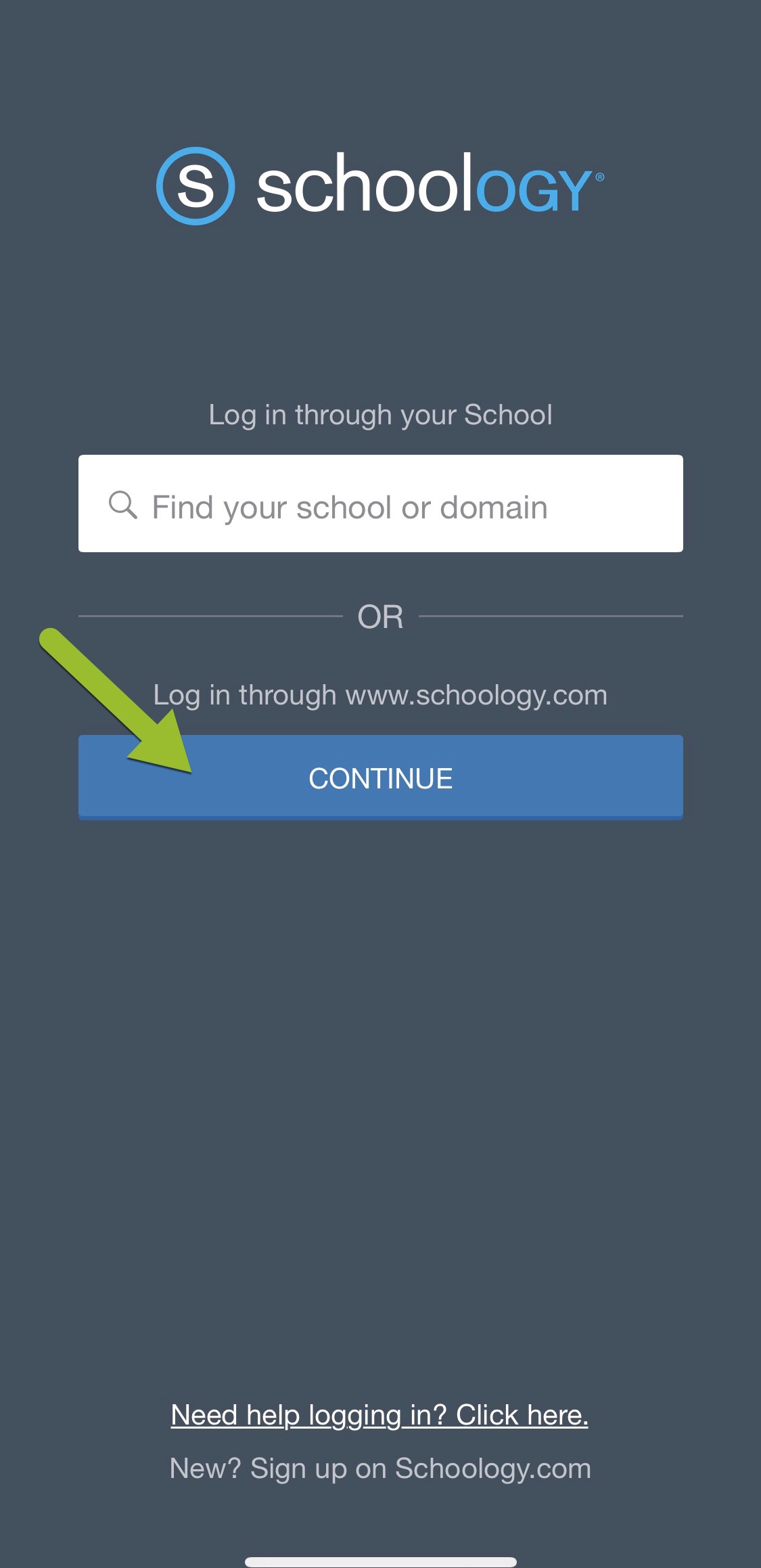 Paso 1: Pulse CONTINUAR para iniciar sesión a través de www.schoology.com. Los alumnos que inician sesión con un código QR deben continuar hacia el Paso 3.