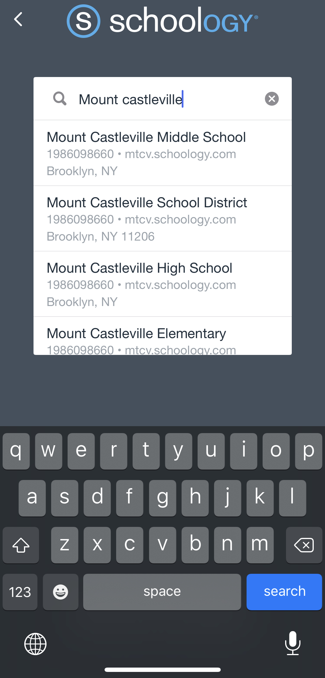 Paso 2: Para Encontrar su centro educativo o dominio, utilice el teclado para ingresar el nombre del centro educativo u organización. A medida que escriba, la lista se completará automáticamente con las coincidencias guardadas. Si el centro educativo utiliza un dominio personalizado (URL) en la versión web, puede ingresar el dominio en el campo de búsqueda.