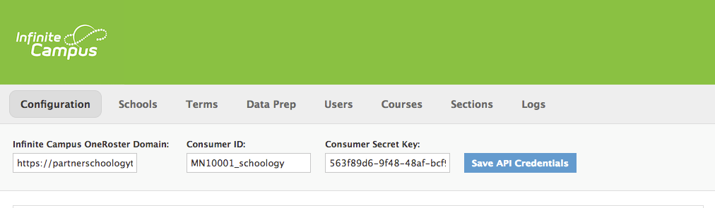 Paso 1: Ingrese la información de la API que obtuvo a través del representante de Infinite Campus en los campos Dominio OneRoster de Infinite Campus, ID de consumidor y Clave secreta de consumidor.