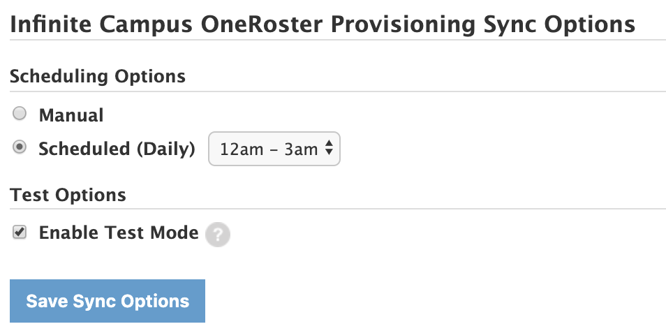 Paso 3: Utilice el campo Opciones de programación en el área Opciones de sincronización para el aprovisionamiento de OneRoster de Infinite Campus para determinar si la sincronización entre Infinite Campus y Schoology se realizará de forma manual o programada y establecer la frecuencia de la sincronización.