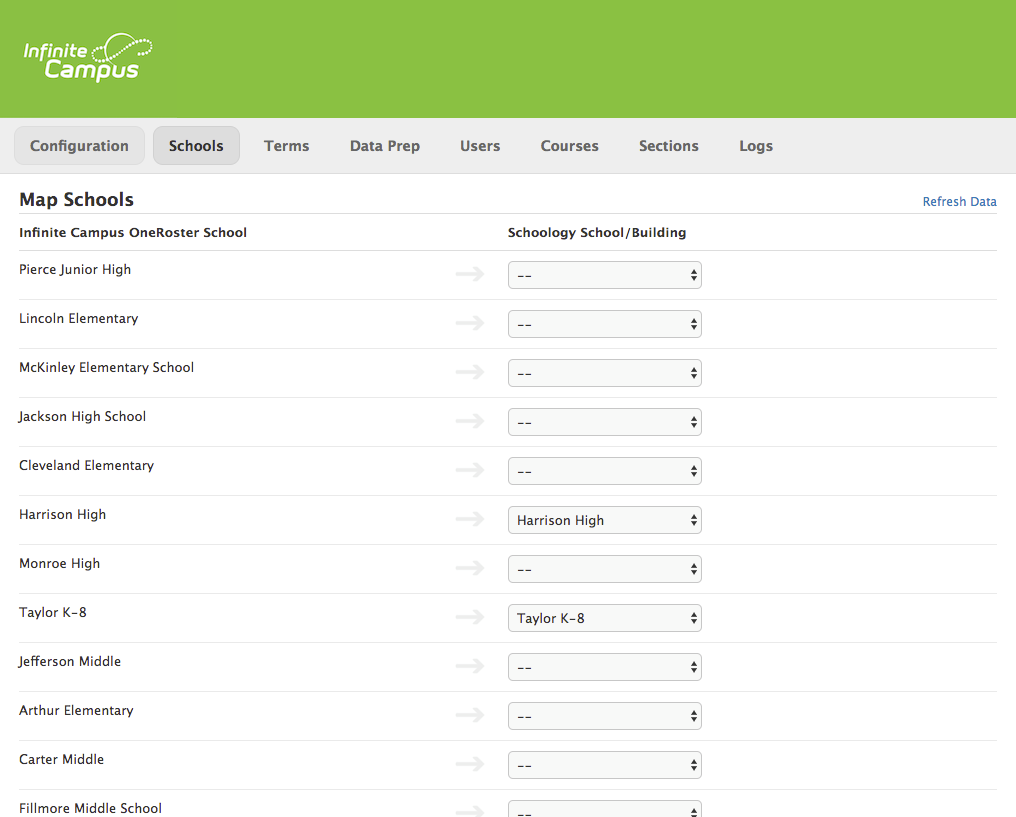 Si ya existen campus en Schoology, puede crear una asignación correlativa entre los campus de Infinite Campus y los de Schoology.