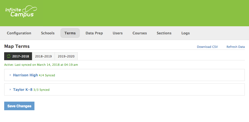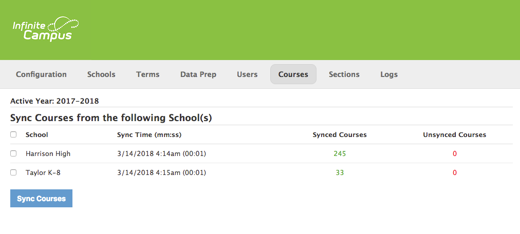 Nota importante: Recomendamos firmemente que las organizaciones no sincronicen los cursos y las inscripciones creados en Infinite Campus hasta que se haya completado el programa del año y este se haya establecido como "activo". Si la integración se configura con cursos e inscripciones programados para sincronizarse con Schoology mientras haya "pruebas" del programa en Infinite Campus, es posible que se creen cursos duplicados en Schoology a partir de las pruebas existentes.
