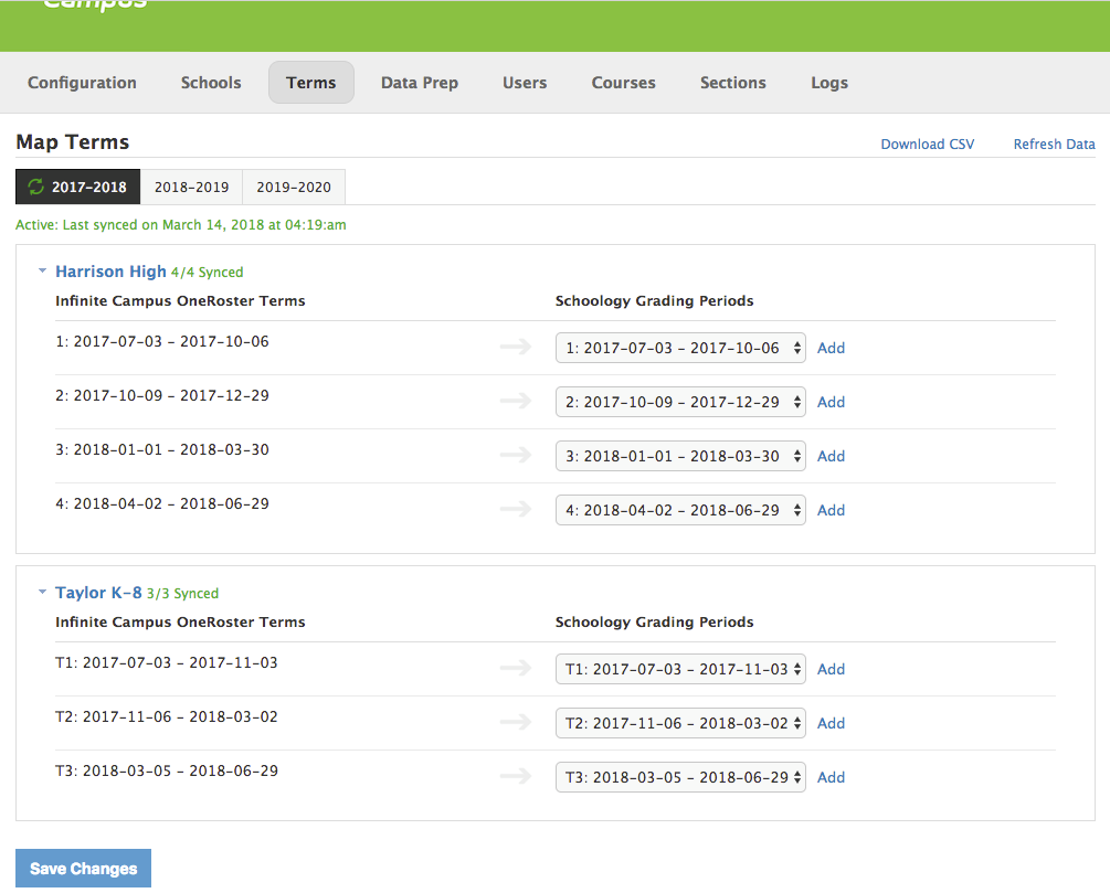 Nota: Luego de configurar las pestañas Configuración, Centros educativos y Períodos académicos, comuníquese con el representante de Schoology antes de continuar con el resto de la integración de Infinite Campus. El equipo de Schoology le proporcionará una guía e instrucciones adicionales para garantizar una integración sin problemas. Puede trabajar con el representante de Schoology para utilizar la herramienta de Preparación de datos y asegurar una integración exitosa.