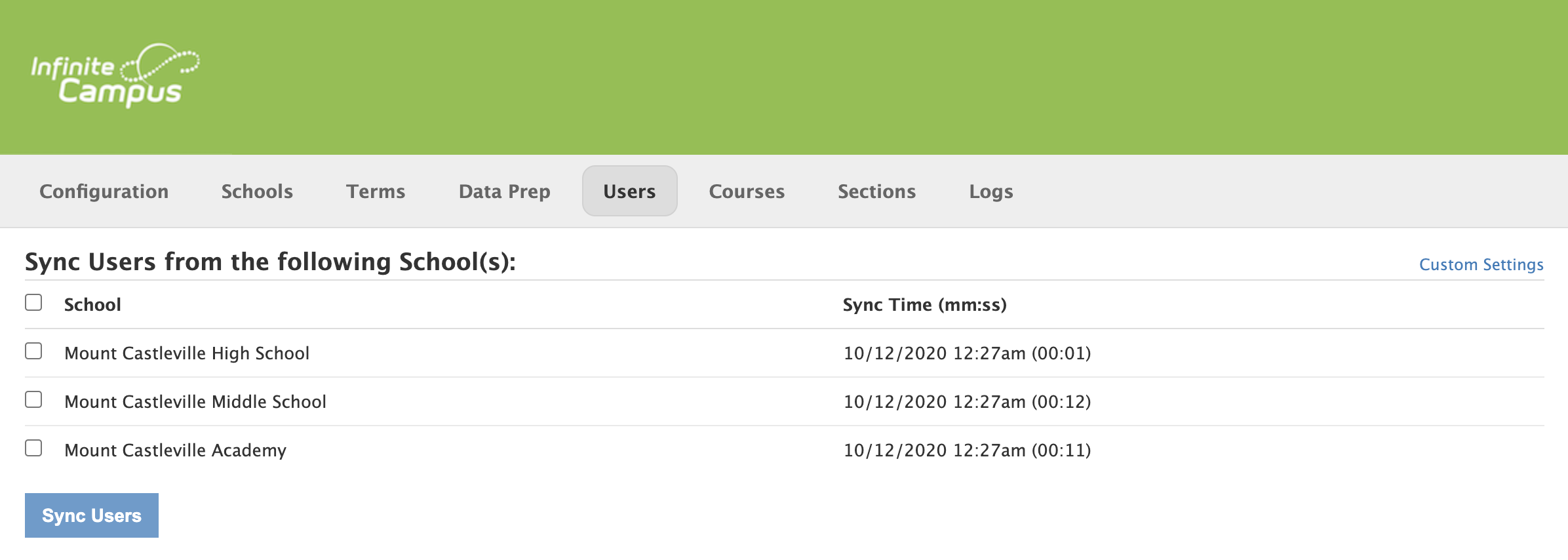 Si no desea agregar campus adicionales en Schoology, puede asignar los campus de Infinite Campus a un único campus de Schoology.