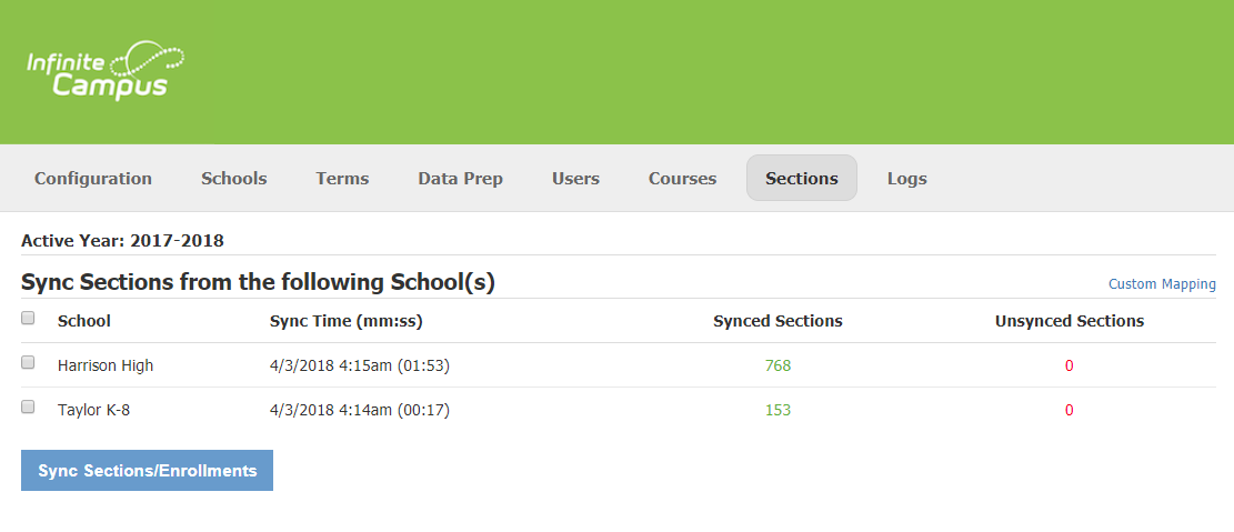 Para aprovisionar Schoology con secciones e inscripciones de su instancia de Infinite Campus, seleccione los centros educativos para los que desea que se aprovisionen las secciones. Luego, haga clic en Sincronizar secciones/inscripciones para agregar en Schoology las secciones e inscripciones de Infinite Campus.