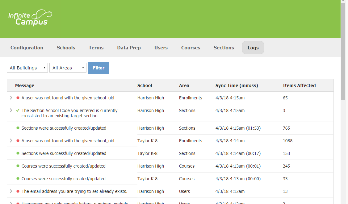 Use el área Registros de la aplicación para ver el progreso de la sincronización con Infinite Campus. Los registros también le permiten detectar cualquier error que se produzca durante la sincronización.