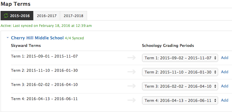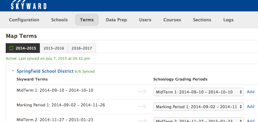 Tras completar la configuración de las pestañas Configuración y Centros educativos, podrá asignar los períodos académicos de Skyward a los períodos de evaluación de Schoology.