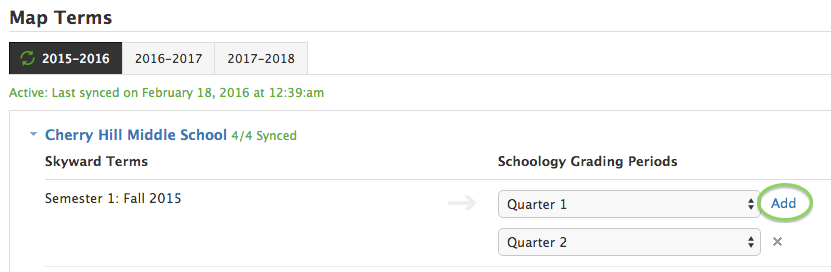 Después de crear los periodos de evaluación en Schoology, podrá asignar un periodo académico de Skyward a más de un periodo de evaluación de Schoology; para esto, debe hacer clic en el enlace Agregar situado a la derecha del periodo académico de Schoology y seleccionar el mismo periodo en ambos menús desplegables.