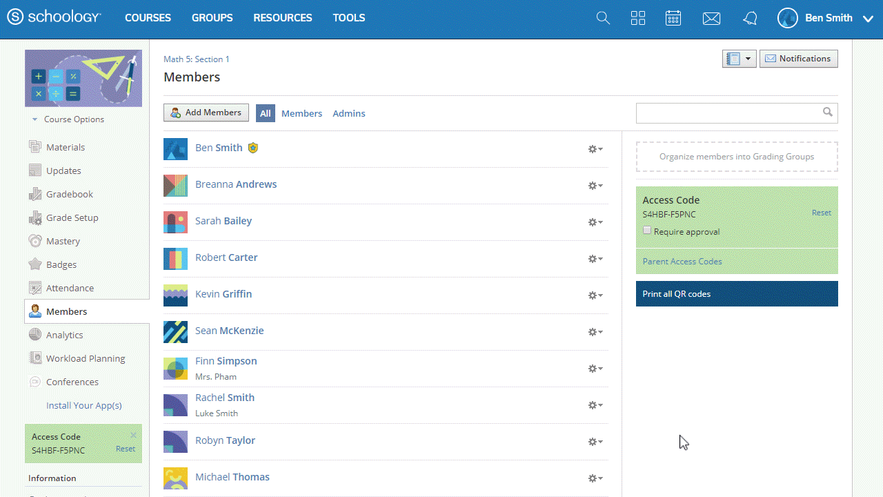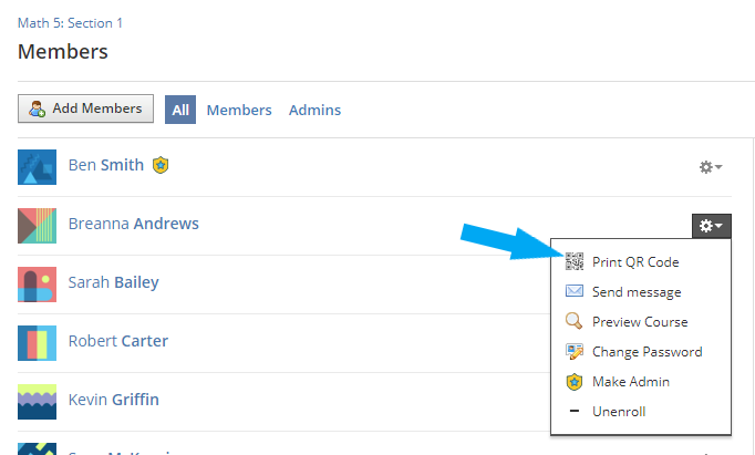 Los administradores del curso que tengan el permiso habilitado pueden imprimir los códigos QR de sus alumnos desde el área Miembros de los cursos que administran. Puede imprimir códigos QR para alumnos individuales o de manera masiva para toda la clase.