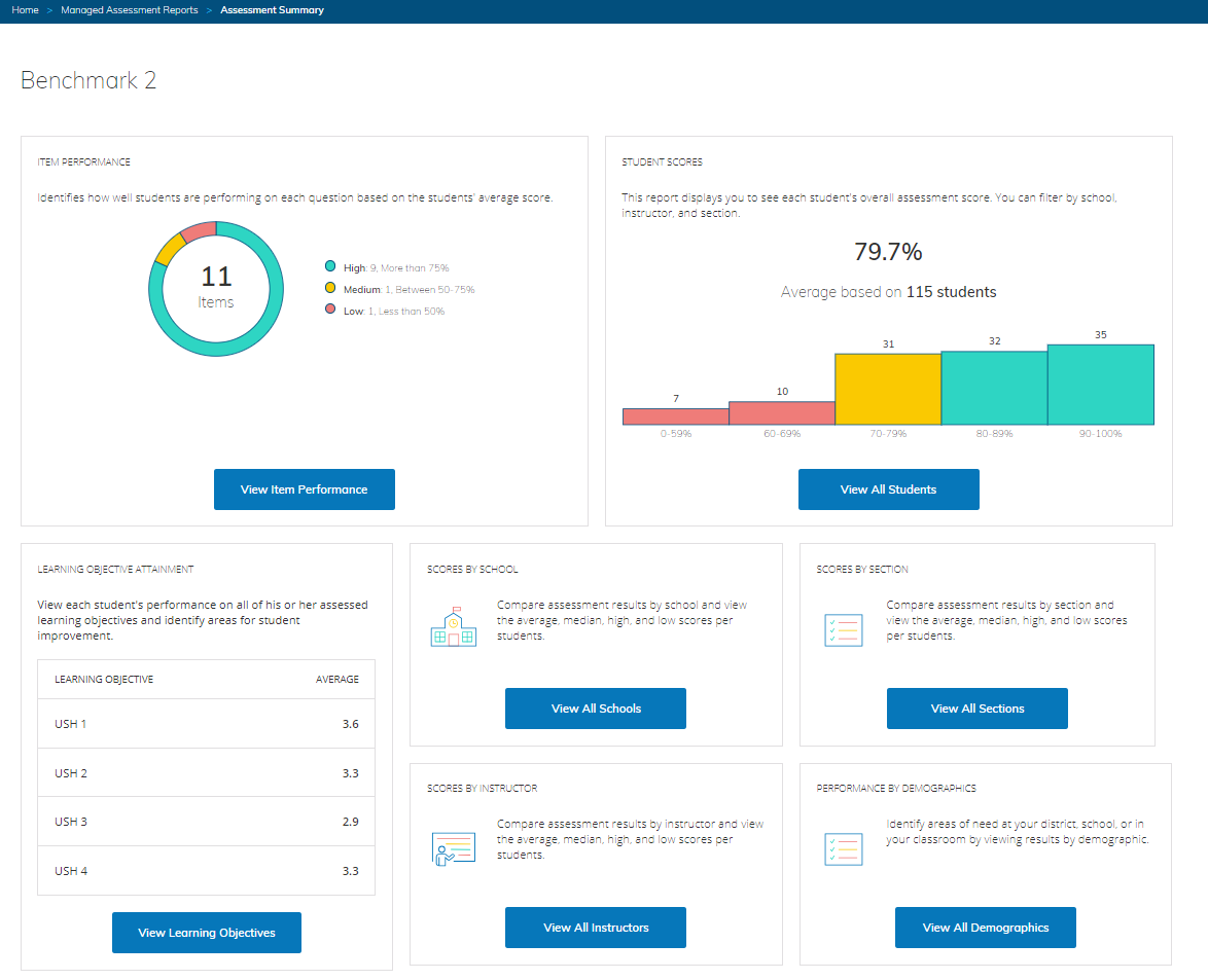 Luego de crear y distribuir las evaluaciones gestionadas, los educadores pueden evaluar los resultados de los alumnos mediante los informes de evaluaciones: