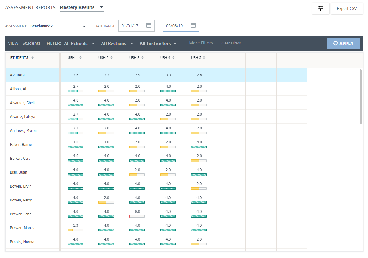 La fila Promedio calcula y muestra la puntuación de desempeño promedio para todos los alumnos de acuerdo con los estándares alineados con la evaluación gestionada. Estos promedios se actualizan si se aplican filtros a la tabla de resultados.