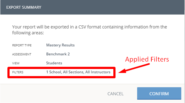 Nota: Es posible aplicar filtros en la exportación para que esta solo contenga secciones, instructores y centros educativos específicos. Los rangos de puntuaciones o los filtros demográficos de + Más filtros no se aplicarán en el CSV exportado. Los filtros aplicados podrán visualizarse en Exportar resumen.