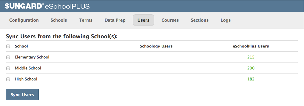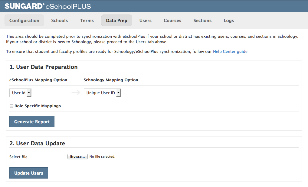 Es muy recomendable que trabaje con un representante de Schoology en el proceso de preparación de datos. Este paso sirve para sincronizar los datos de eSchoolPlus con cualquier usuario, curso o sección existente en Schoology para asegurarse de que no se generen duplicados al sincronizar por primera vez.