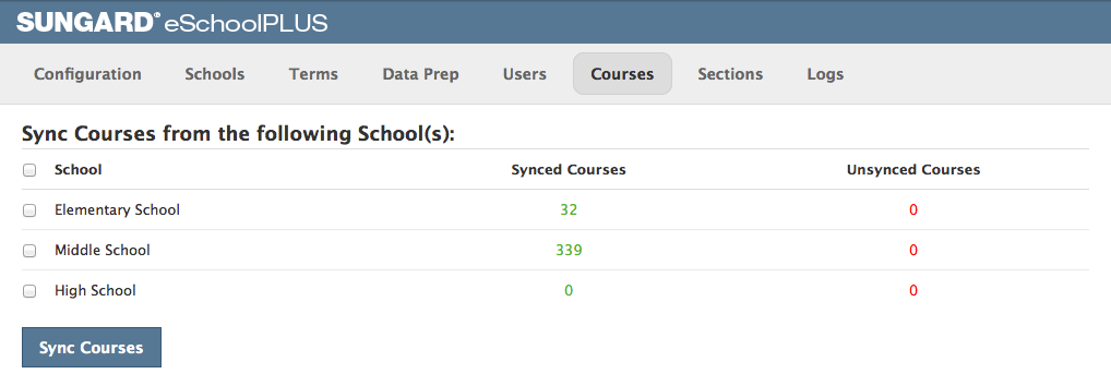 En la pestaña Cursos , puede seleccionar el campus del cual sincronizar cursos.