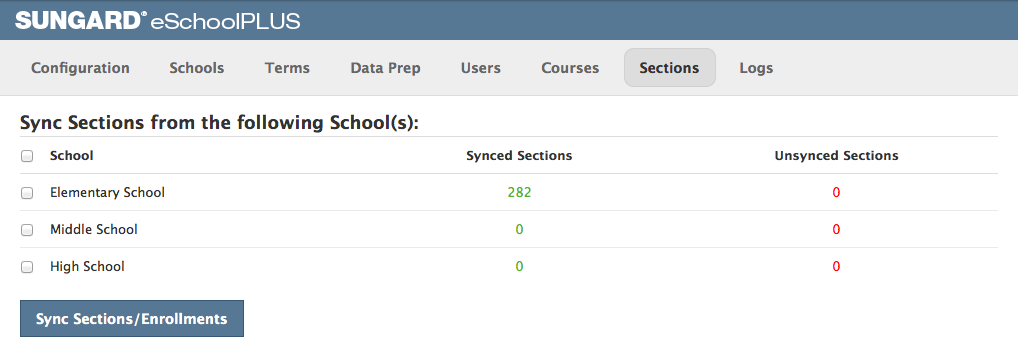 En la pestaña Secciones , puede seleccionar el campus del cual sincronizar secciones de cursos.