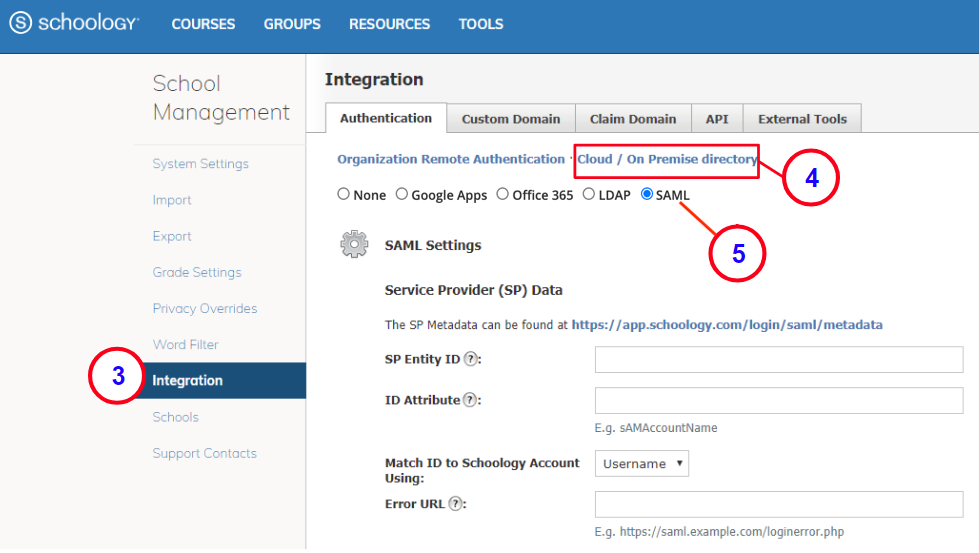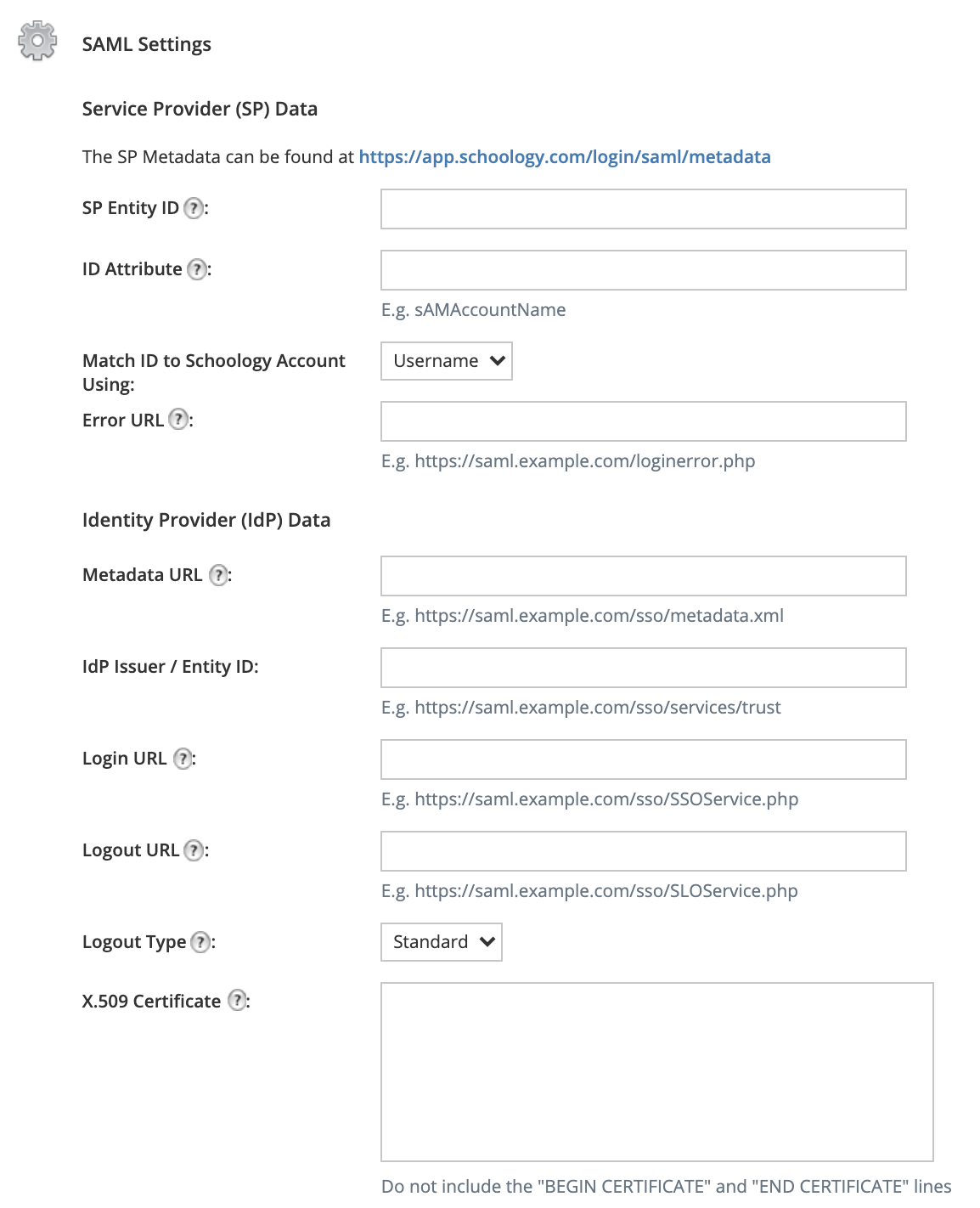 Nota: Si utiliza un dominio o subdominio personalizado, el URL de metadatos de SP deberá contener el dominio personalizado. Si ingresa a Schoology sin utilizar el dominio personalizado, el URL de metadatos que figura en la página de configuración será incorrecto (ya que no contendrá el dominio personalizado).