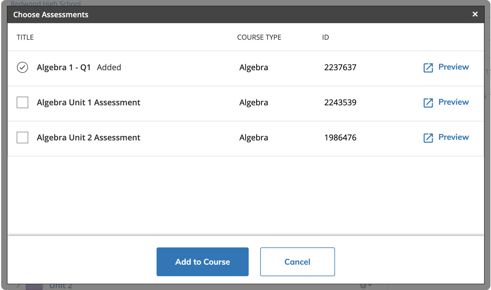 Seleccione las evaluaciones deseadas desde el cuadro de diálogo. Haga clic en Vista previa si desea revisar una evaluación antes de agregarla a su curso. Esto abrirá la evaluación en una nueva pestaña y la mostrará en el formato de evaluación de Asuntos de desempeño en línea. Para que una prueba aparezca en el modo Agregar evaluación estándar, debe estar disponible en el Centro de pruebas y lista para administrarse.