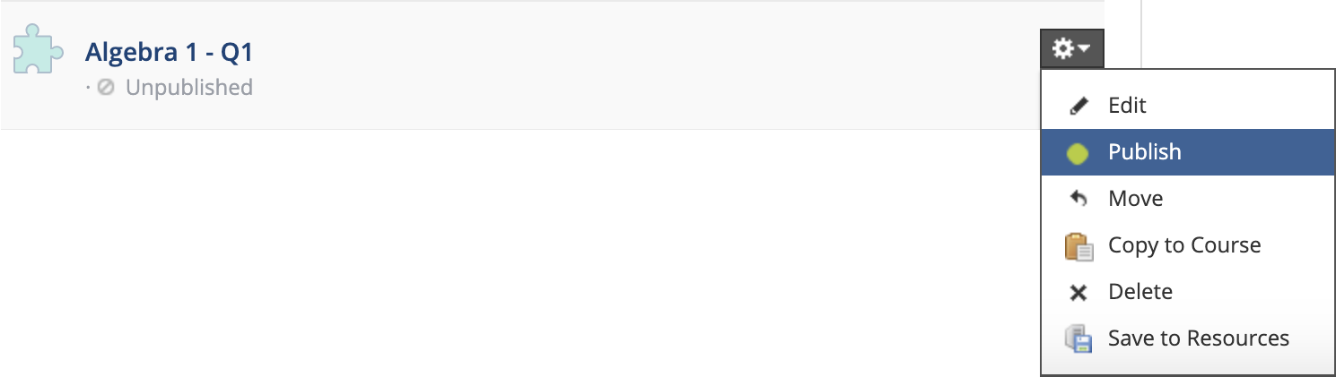 La evaluación está disponible automáticamente para que los alumnos puedan acceder a ella y realizarla. Esto significa que usted no tiene que asignar la evaluación a los alumnos como lo requiere Asuntos de desempeño. Además, los alumnos solo verán la evaluación seleccionada en el flujo de trabajo anterior en Schoology, en lugar de ver todas las evaluaciones existentes, como aparece en Asuntos de desempeño.Se anula la publicación de la evaluación por defecto. Haga clic en el icono de engranaje ubicado a la derecha de la evaluación y seleccione Publicar para que la evaluación esté disponible para los alumnos: