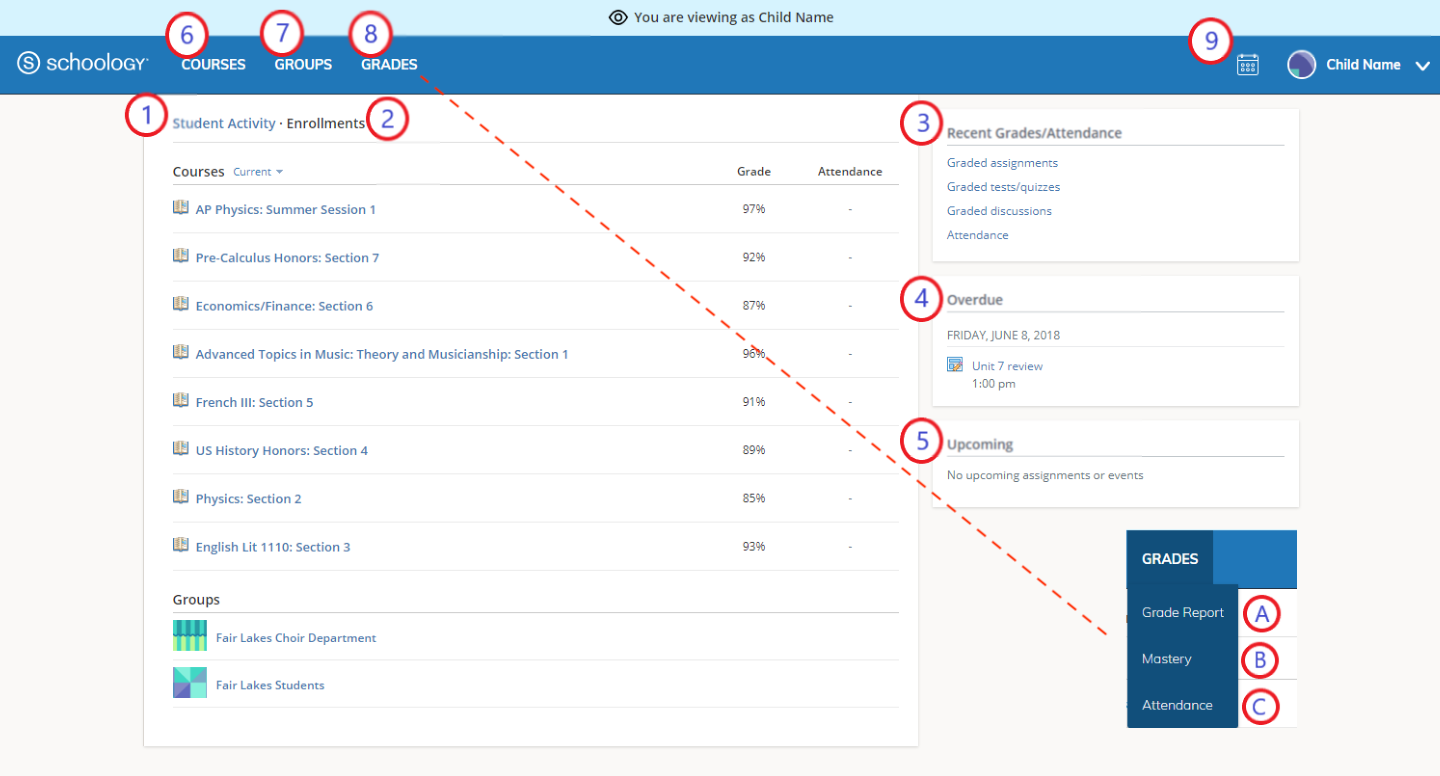 Visualización de la actividad de su hijo. Desde aquí, puede ver Schoology desde la perspectiva de su hijo: ver lo que él ve y recibir actualizaciones sobre su actividad.