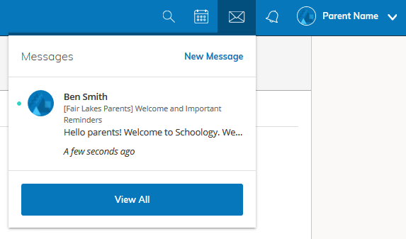 Acceda a sus mensajes desde el icono Mensajes (icono de sobre) en el encabezado. Según la configuración de su centro educativo, es posible que pueda intercambiar mensajes con los docentes de su centro educativo.