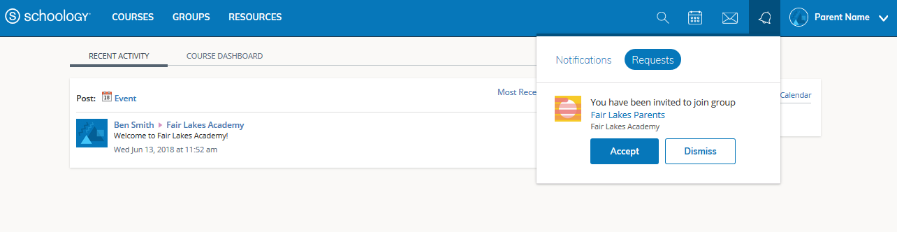 En el ejemplo que se muestra a continuación, un padre recibe una invitación para unirse a un grupo: