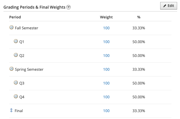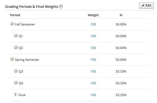 En el área Configuración de calificaciones del curso, en Períodos de evaluación y ponderaciones finales, podrá visualizar cómo se calcula un parcial o final. En Configuración de calificaciones, podrá ajustar la ponderación del parcial o final tal como ajustaría un período de evaluación o subperíodo. También puede utilizar el icono de flecha doble para arrastrar y mover el elemento. Al mover el elemento, se pueden modificar los períodos de evaluación con los que se ponderará el parcial o final.